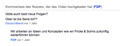 Zum Bundestagswahlkampf 2009 aufgelegt, entwickelte sich die Serie „„Fricke & Solms“ innerhalb von kurzer Zeit zu einem Publikumsmagneten im Netz. Im Stil einer „Sendung mit der Maus“ gekreuzt mit dem ewig streitenden ZDF-Frontal-Duo Hauser und Kienzle, führten die FDP-Bundestagsabgeordneten Fricke und Solms skurrile Dialoge zu aktuellen (Wirtschafts)themen. Nach der Wahl war alles vorbei. Schade eigentlich.